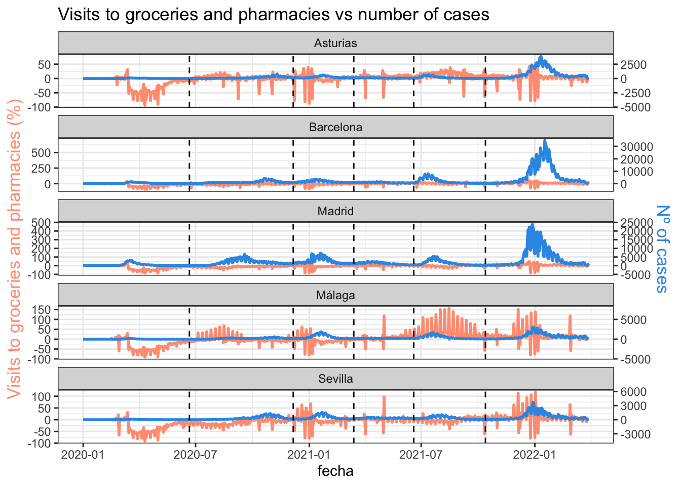 # Value used to transform the datacoeff <-50# A few constants for colorstemperatureColor <-"#ff9e81"priceColor <-rgb(0.2, 0.6, 0.9, 1)covid_data %>%ggplot(aes(x = fecha)) +geom_line( aes(y = mob_grocery_pharmacy), size=1, color=temperatureColor) +geom_line( aes(y = num_casos / coeff), size=1, color=priceColor) +geom_vline(xintercept =as.Date("2020-06-21", format ="%Y-%m-%d"), linetype="dashed") +geom_vline(xintercept =as.Date("2020-12-06", format ="%Y-%m-%d"), linetype="dashed") +geom_vline(xintercept =as.Date("2021-03-14", format ="%Y-%m-%d"), linetype="dashed") +geom_vline(xintercept =as.Date("2021-06-19", format ="%Y-%m-%d"), linetype="dashed") +geom_vline(xintercept =as.Date("2021-10-13", format ="%Y-%m-%d"), linetype="dashed") +scale_y_continuous(# Features of the first axisname ="Visits to groceries and pharmacies (%)",# Add a second axis and specify its featuressec.axis =sec_axis(~.*coeff, name="Nº of cases") ) +facet_wrap(~provincia, scales ="free_y", ncol=1) +theme_bw() +theme(axis.title.y =element_text(color = temperatureColor, size=13),axis.title.y.right =element_text(color = priceColor, size=13) ) +ggtitle("Visits to groceries and pharmacies vs number of cases")