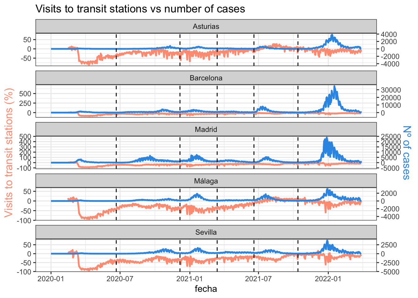 # Value used to transform the datacoeff <-50# A few constants for colorstemperatureColor <-"#ff9e81"priceColor <-rgb(0.2, 0.6, 0.9, 1)covid_data %>%ggplot(aes(x = fecha)) +geom_line( aes(y = mob_transit_stations), size=1, color=temperatureColor) +geom_line( aes(y = num_casos / coeff), size=1, color=priceColor) +geom_vline(xintercept =as.Date("2020-06-21", format ="%Y-%m-%d"), linetype="dashed") +geom_vline(xintercept =as.Date("2020-12-06", format ="%Y-%m-%d"), linetype="dashed") +geom_vline(xintercept =as.Date("2021-03-14", format ="%Y-%m-%d"), linetype="dashed") +geom_vline(xintercept =as.Date("2021-06-19", format ="%Y-%m-%d"), linetype="dashed") +geom_vline(xintercept =as.Date("2021-10-13", format ="%Y-%m-%d"), linetype="dashed") +scale_y_continuous(# Features of the first axisname ="Visits to transit stations (%)",# Add a second axis and specify its featuressec.axis =sec_axis(~.*coeff, name="Nº of cases") ) +facet_wrap(~provincia, scales ="free_y", ncol=1) +theme_bw() +theme(axis.title.y =element_text(color = temperatureColor, size=13),axis.title.y.right =element_text(color = priceColor, size=13) ) +ggtitle("Visits to transit stations vs number of cases")