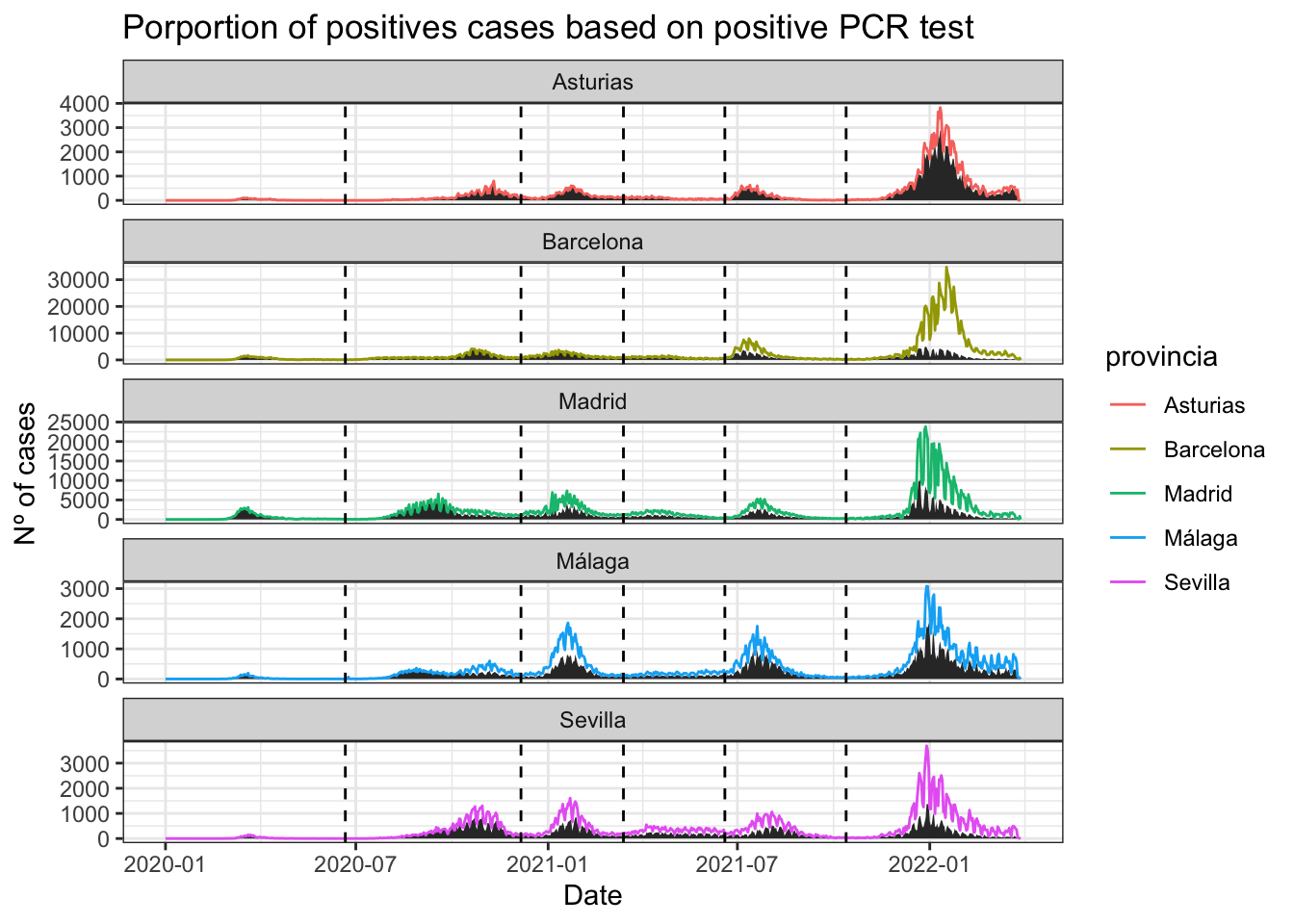 covid_data %>%ggplot(aes(x = fecha)) +geom_area(aes(y = num_casos_prueba_pcr)) +geom_line(aes(y = num_casos, color = provincia)) +geom_vline(xintercept =as.Date("2020-06-21", format ="%Y-%m-%d"), linetype="dashed") +geom_vline(xintercept =as.Date("2020-12-06", format ="%Y-%m-%d"), linetype="dashed") +geom_vline(xintercept =as.Date("2021-03-14", format ="%Y-%m-%d"), linetype="dashed") +geom_vline(xintercept =as.Date("2021-06-19", format ="%Y-%m-%d"), linetype="dashed") +geom_vline(xintercept =as.Date("2021-10-13", format ="%Y-%m-%d"), linetype="dashed") +facet_wrap(~provincia, scales ="free_y", ncol=1) +theme(legend.position ="top") +labs(title="Porportion of positives cases based on positive PCR test",x ="Date", y ="Nº of cases") +theme_bw()