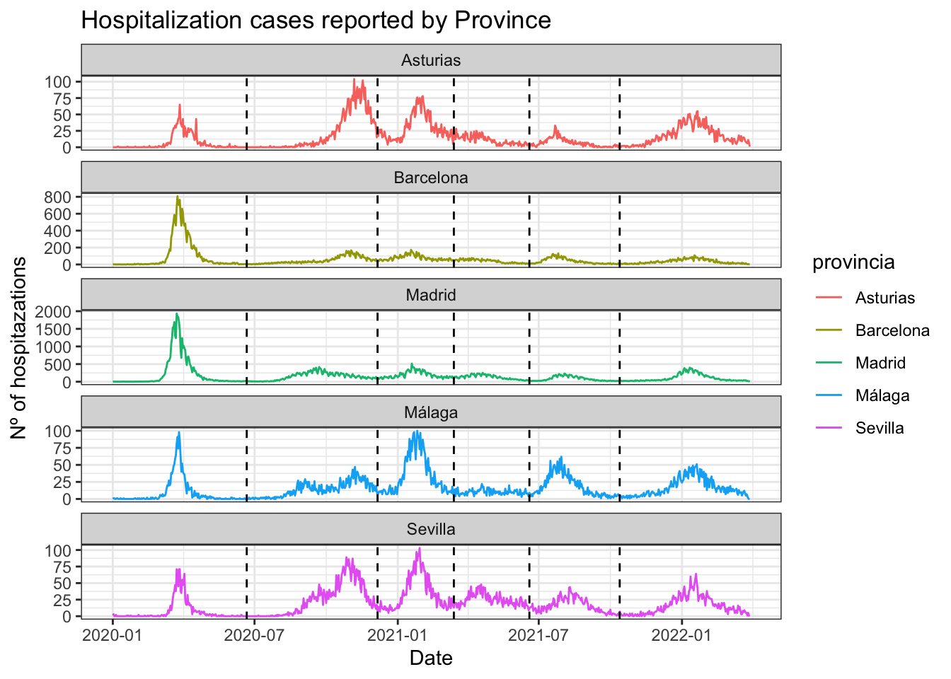 covid_data %>%ggplot() +geom_line(aes(x = fecha, y = num_hosp, color = provincia)) +geom_vline(xintercept =as.Date("2020-06-21", format ="%Y-%m-%d"), linetype="dashed") +geom_vline(xintercept =as.Date("2020-12-06", format ="%Y-%m-%d"), linetype="dashed") +geom_vline(xintercept =as.Date("2021-03-14", format ="%Y-%m-%d"), linetype="dashed") +geom_vline(xintercept =as.Date("2021-06-19", format ="%Y-%m-%d"), linetype="dashed") +geom_vline(xintercept =as.Date("2021-10-13", format ="%Y-%m-%d"), linetype="dashed") +facet_wrap(~provincia, scales ="free_y", ncol=1) +theme(legend.position ="top") +labs(title="Hospitalization cases reported by Province",x ="Date", y ="Nº of hospitazations") +theme_bw()